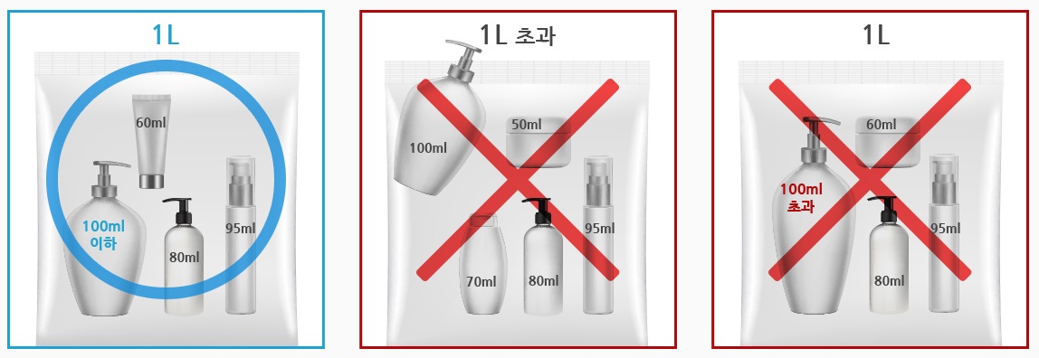 - 기내휴대 : 개별 용기당 100ml 이하, 1인당 총 1L의 비닐 지퍼백 1개 가능